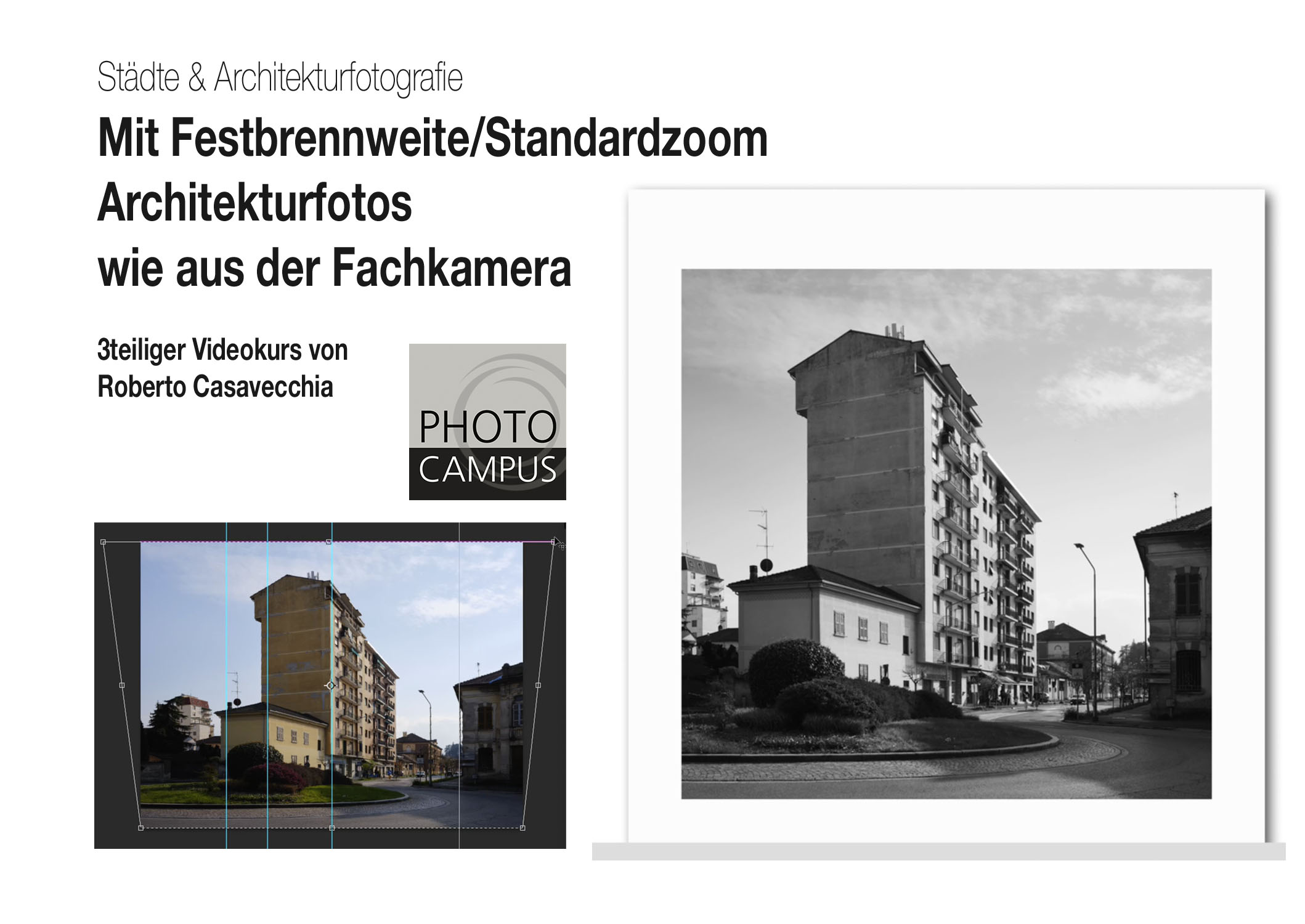 Dieser dreiteilige Video-Kurs zeigt, wie du ohne Shift-Objektiv Städte- und Architekturaufnahmen ohne stürzende Linien machen kannst. Du benötigst eine digitale Kamera (MFT/APS-C/Kleinbild oder Mittelformat), eine Festbrennweite oder ein Standardzoom, ein Stativ mit einer Gradeinteilung um die Neigung der Kamera kontrolliert vornehmen zu können und zum Entzerren der Bilder Photoshop mit entsprechenden Ebenen-Funktionen. Beinahe in allen Anwendungsfällen ist neigen besser als shiften. Zwar haben Shiftobjektive sehr viele Vorteile, doch neben dem Preis und dem Gewicht ist ein wesentlicher Nachteil, dass sich bei Verstellung die Verzeichnung des Objektivs ändert, was sehr schwierig zu korrigieren ist.